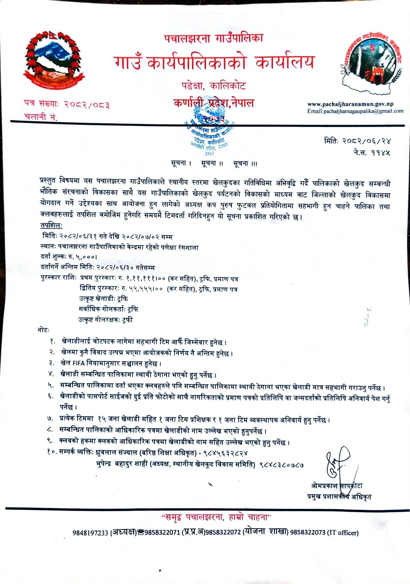 सुर्खेत । कालीकोट पचालझरना गाउँपालिकाको आयोजनामा अध्यक्ष कप पुरुष फुटबल प्रतियोगिता संचालन हुँने भएको छ ।